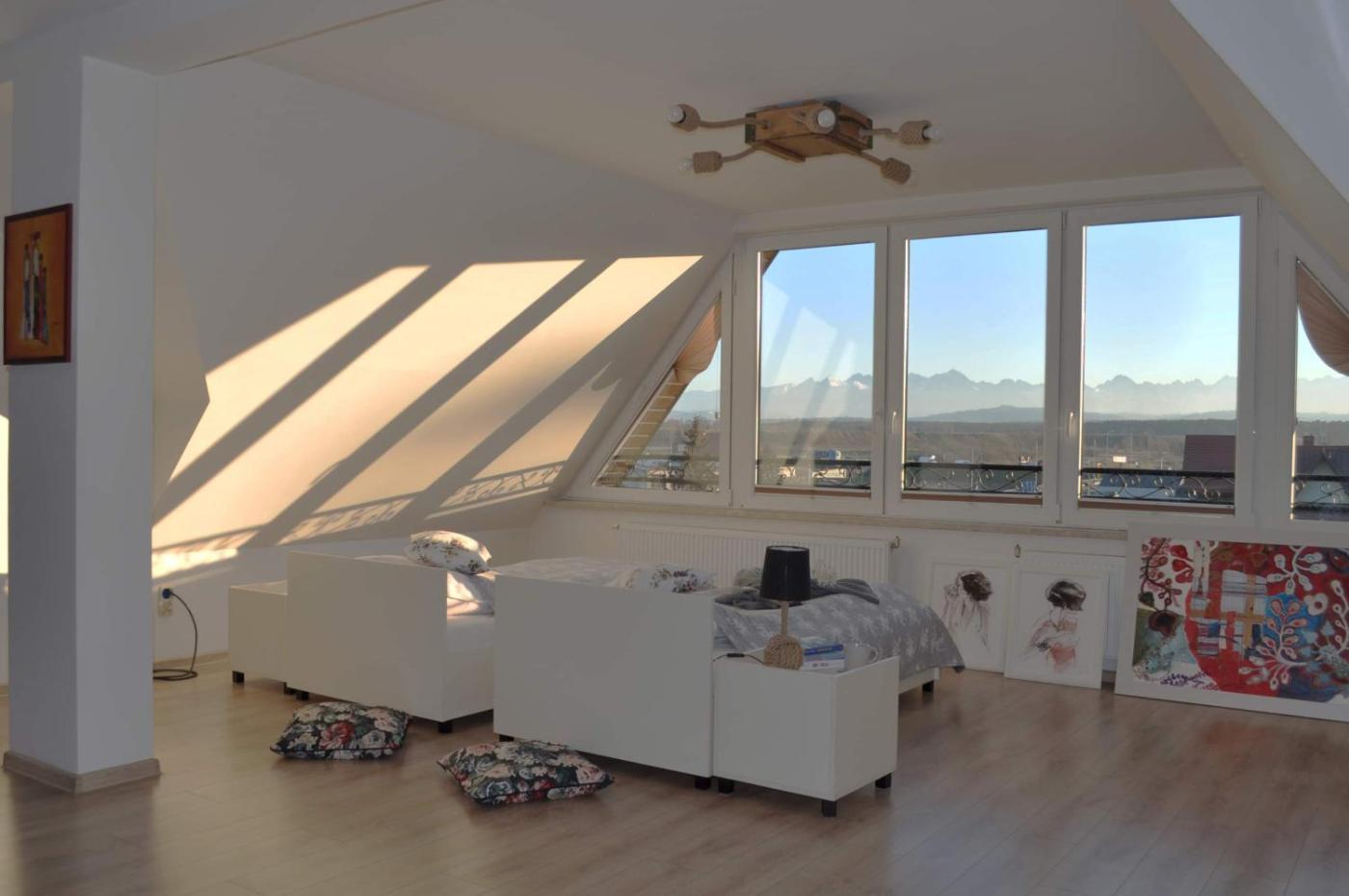 Pokój rodzinny z widokiem na góry. The family room features a wardrobe, heating, a balcony with mountain views as well as a private bathroom boasting a shower. The unit has 4 beds. Rodzinny - 5 osobowy. Powierzchnia pokoju ok.: 25 mkw. ;