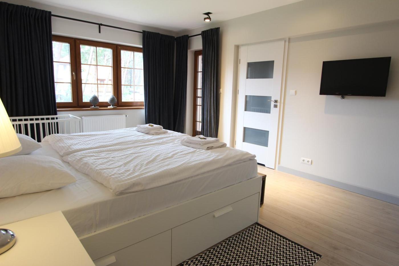 Domek. The private pool is the special feature of this chalet. Featuring a private entrance, this spacious chalet also comprises 4 bedrooms, a seating area and 2 bathrooms with a bath and a shower. Guests will find a stovetop, a refrigerator, a dishwasher and kitchenware in the kitchen. The chalet also provides guests with a barbecue. Boasting a terrace with garden views, this chalet also provides a washing machine and a flat-screen TV. The unit offers 5 beds. Domek - 8 osobowy. Powierzchnia pokoju ok.: 132 mkw. ;