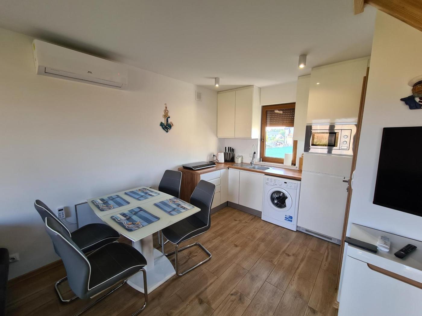 Dom z 2 sypialniami. Featuring a private entrance, this air-conditioned holiday home is comprised of 1 living room, 2 separate bedrooms and 1 bathroom with a shower and a hairdryer. Guests will find a refrigerator, kitchenware, a microwave and an electric kettle in the well-fitted kitchen. The holiday home also has a barbecue. Boasting a terrace, this holiday home also offers a washing machine, a wardrobe and a flat-screen TV. The unit offers 4 beds. Dom wakacyjny - 7 osobowy. Powierzchnia pokoju ok.: 49 mkw. ;